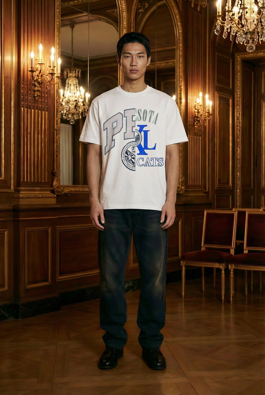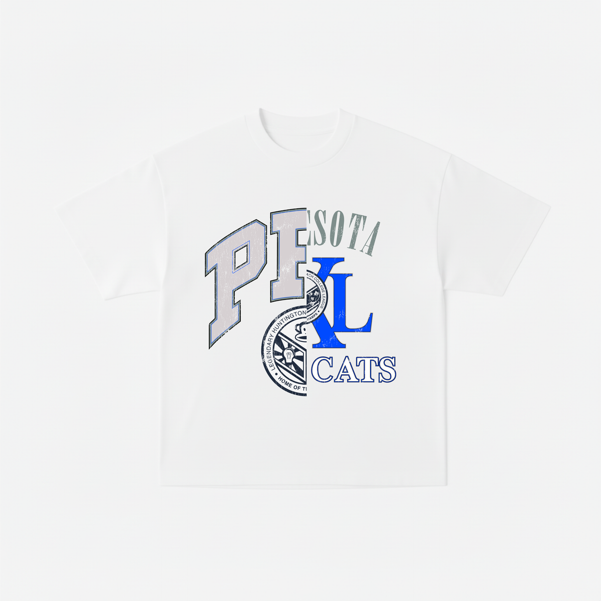 FEATURES COLLEGIATE-INSPIRED GRAPHIC PRINTED ON THE FRONT IN BLUE AND GREY TONES.
