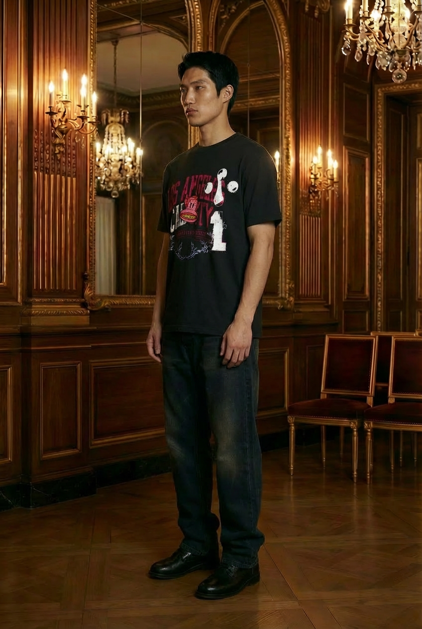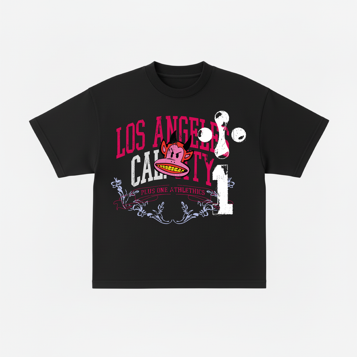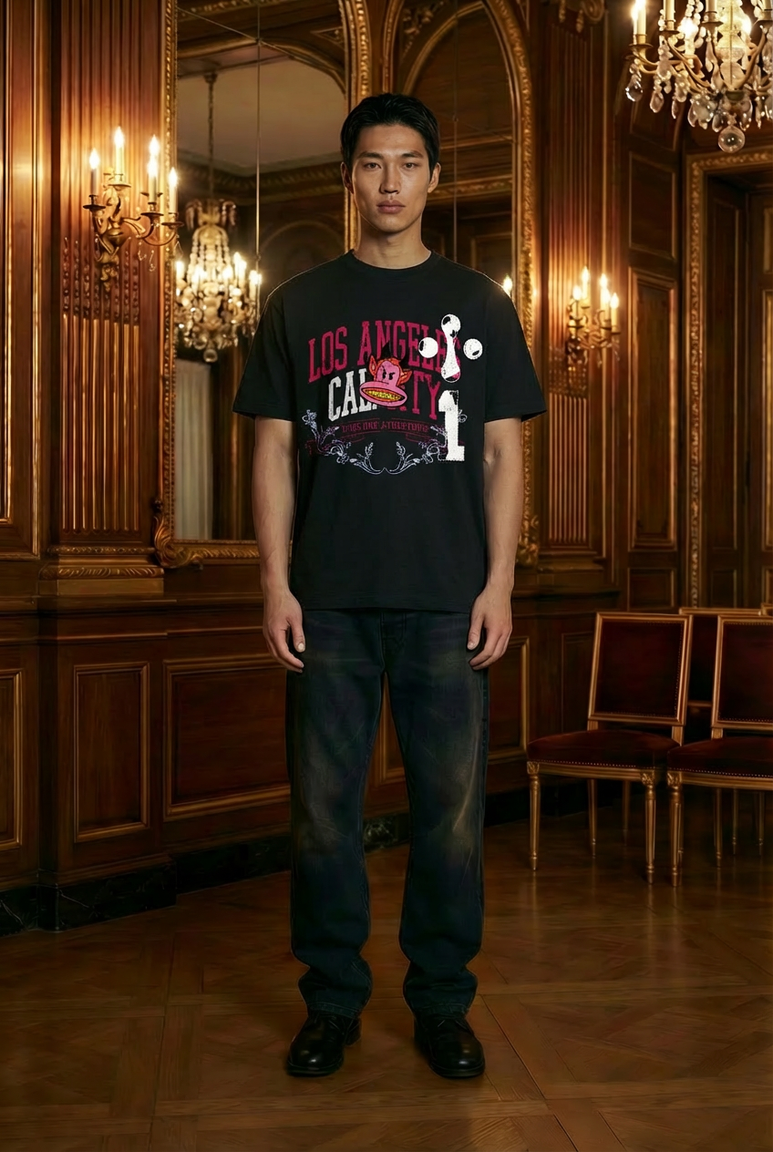 SHORT SLEEVE JERSEY T-SHIRT IN VINTAGE BLACK. SLIGHTLY OVERSIZED FIT, CRAFTED FROM 12/1 OPEN-END COTTON FOR A STRUCTURED YET SOFT HAND FEEL. FEATURES LOS ANGELES CALI ATHLETICS GRAPHIC PRINTED ON THE FRONT, BLENDING WEST COAST COLLEGIATE STYLE WITH SIGNATURE RETOUCHE CHARACTER ELEMENTS. GARMENT-DYED AND SHRINK-FREE FOR LASTING SHAPE AND COLOR INTEGRITY. RIBBED CREWNECK COLLAR AND CLEAN FINISH THROUGHOUT.