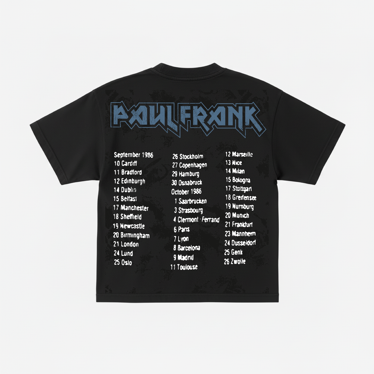 SHORT SLEEVE JERSEY T-SHIRT IN VINTAGE BLACK. SLIGHTLY OVERSIZED FIT, CRAFTED FROM 12/1 OPEN-END COTTON FOR A STRUCTURED YET SOFT HAND FEEL. FEATURES GUITAR TOUR GRAPHIC PRINTED ON THE FRONT AND BACK, INSPIRED BY RETRO METAL BAND MERCHANDISE AND 80S CONCERT TOURS. GARMENT-DYED AND SHRINK-FREE FOR LASTING SHAPE AND COLOR INTEGRITY. RIBBED CREWNECK COLLAR AND CLEAN FINISH THROUGHOUT.