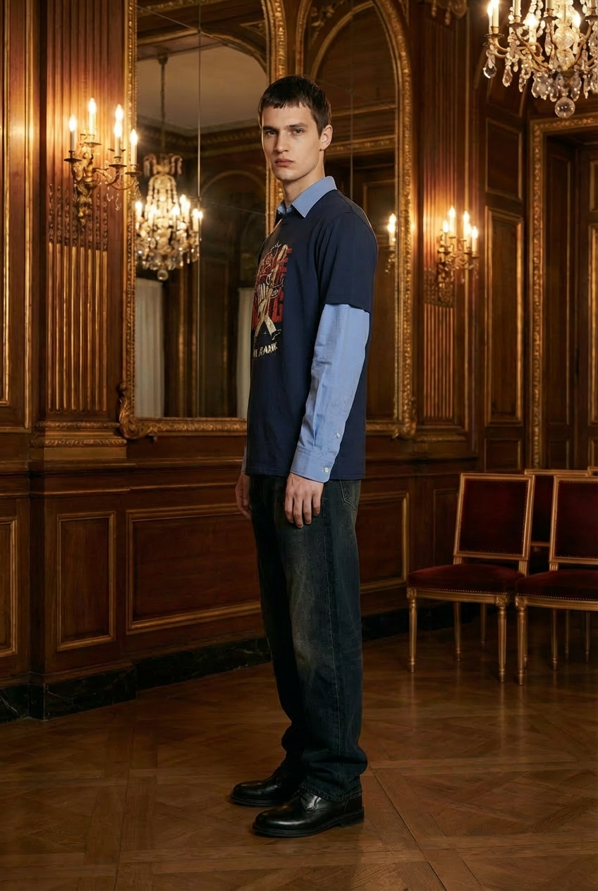 RECONSTRUCTED BY HAND WITH LIGHT-BLUE FLANNEL COLLAR AND SLEEVES, ADDING STRUCTURE, CONTRAST AND A CLEAN TAILORED FEEL TO THE VINTAGE JERSEY BODY.