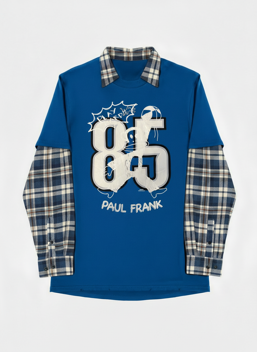 FRONT FEATURES AN ORIGINAL PAUL FRANK GRAPHIC APPLIED MANUALLY, BLENDED WITH THE LARGE “85” PRINT FOR A STRIKING LAYERED EFFECT.