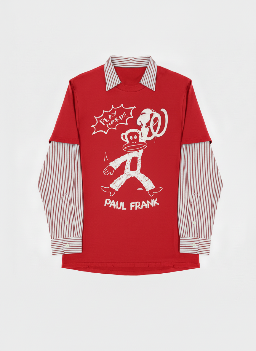 FRONT FEATURES AN ORIGINAL PAUL FRANK GRAPHIC APPLIED MANUALLY, LAYERED OVER THE VINTAGE SPORTS PRINT FOR A BOLD, MIXED-MEDIA AESTHETIC.