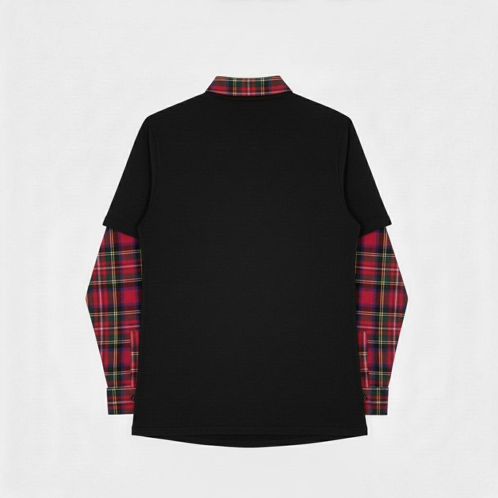 Reconstructed by hand with red tartan flannel collar and sleeves, adding structure, contrast and a bold rock-inspired twist to the black jersey body.