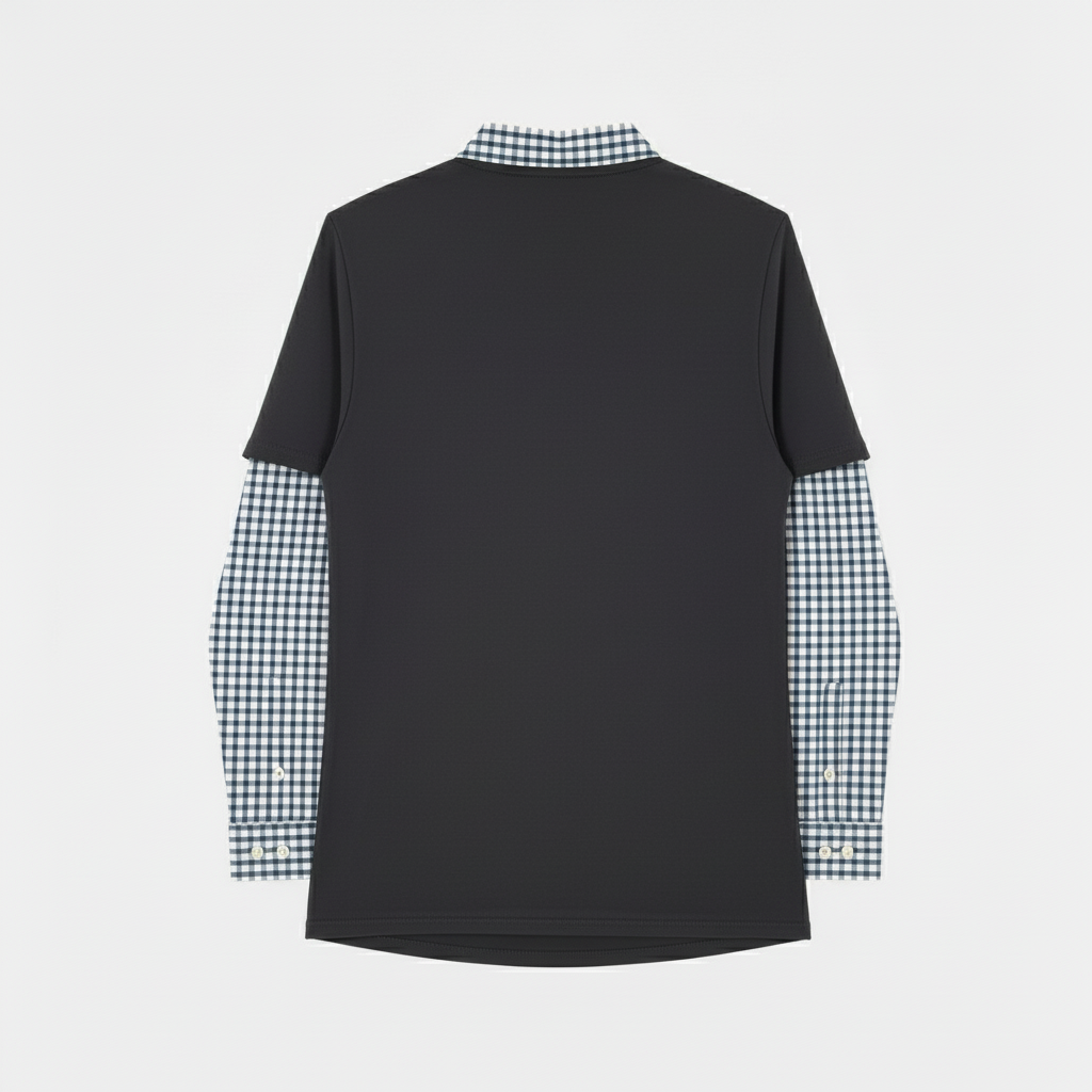 RECONSTRUCTED BY HAND WITH NAVY GINGHAM FLANNEL COLLAR AND SLEEVES, ADDING STRUCTURE, CONTRAST AND A CLEAN COLLEGIATE TWIST TO THE CHARCOAL JERSEY BODY.