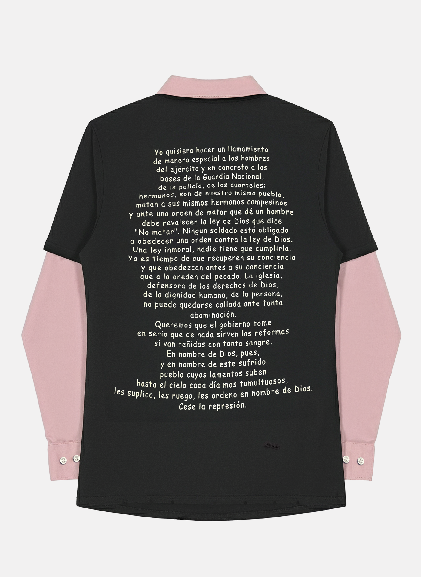 RECONSTRUCTED BY HAND WITH PINK OXFORD COLLAR AND SLEEVES, ADDING STRUCTURE, CONTRAST AND A CLEAN REFINED TWIST TO THE BLACK JERSEY BODY.